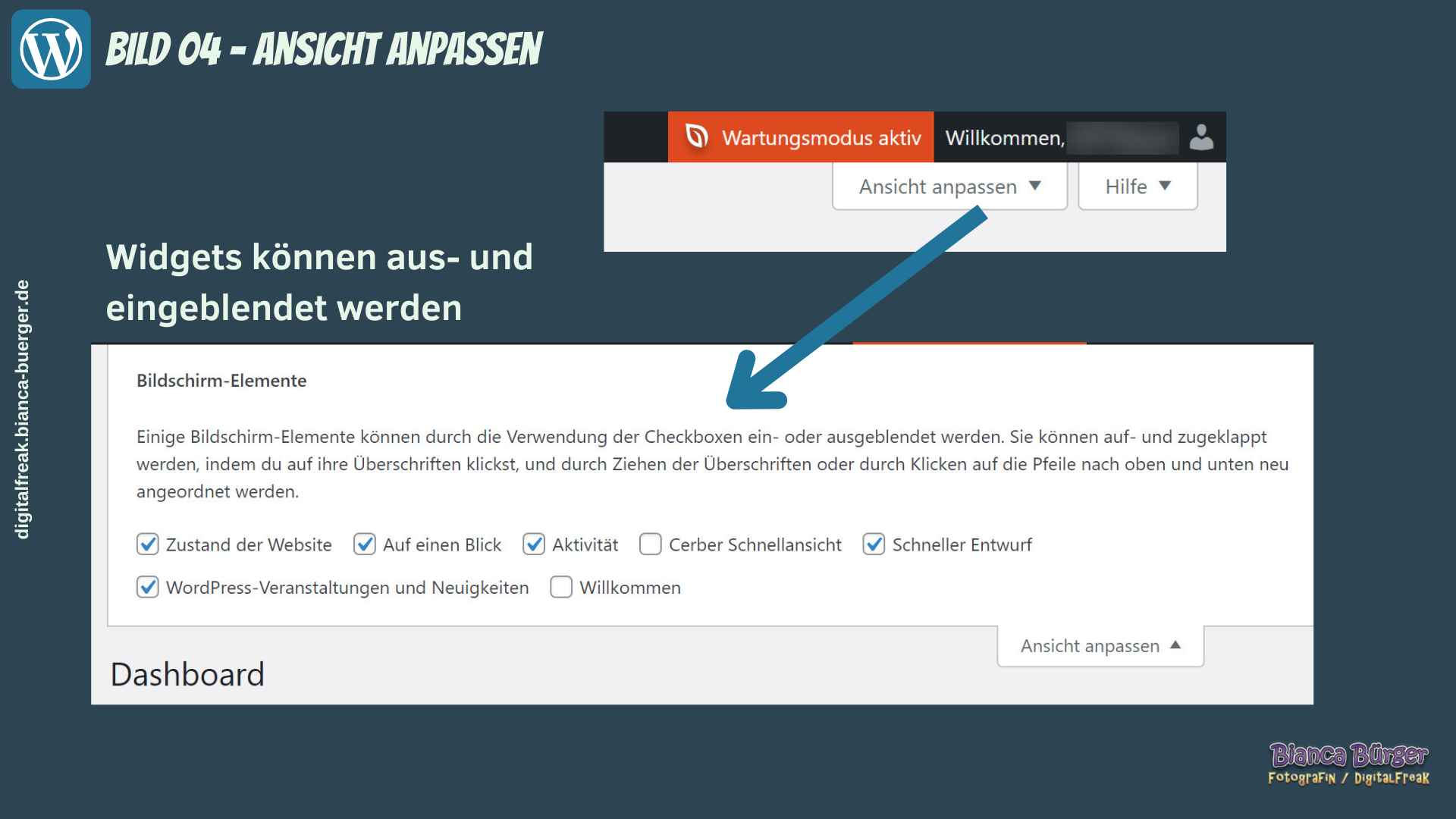 Über „Ansicht anpassen“ (rechts, oben in der Ecke) kannst Du die Widgets ein- oder ausblenden (Bild 4).